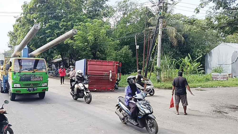 Menurut Mei Hadi, truk merah-biru yang terguling menutup satu jalur arah Cirebon-Jakartata dengan posisi ban kanan truk berada di atas.