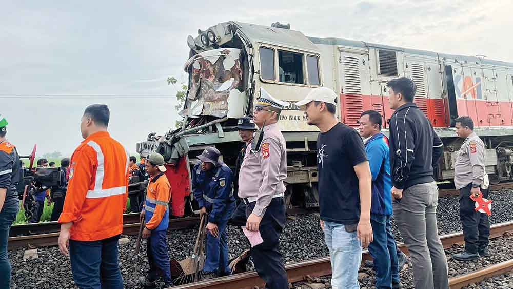Petugas teknis dari KAI Daop 3 Cirebon melakukan proses evakuasi lokomotif KA Menoreh yang mengalami kerusakan berat akibat tertemper truk pengangkut air, Rabu, 21 Januari 2026.* (Foto: Istimewa)
