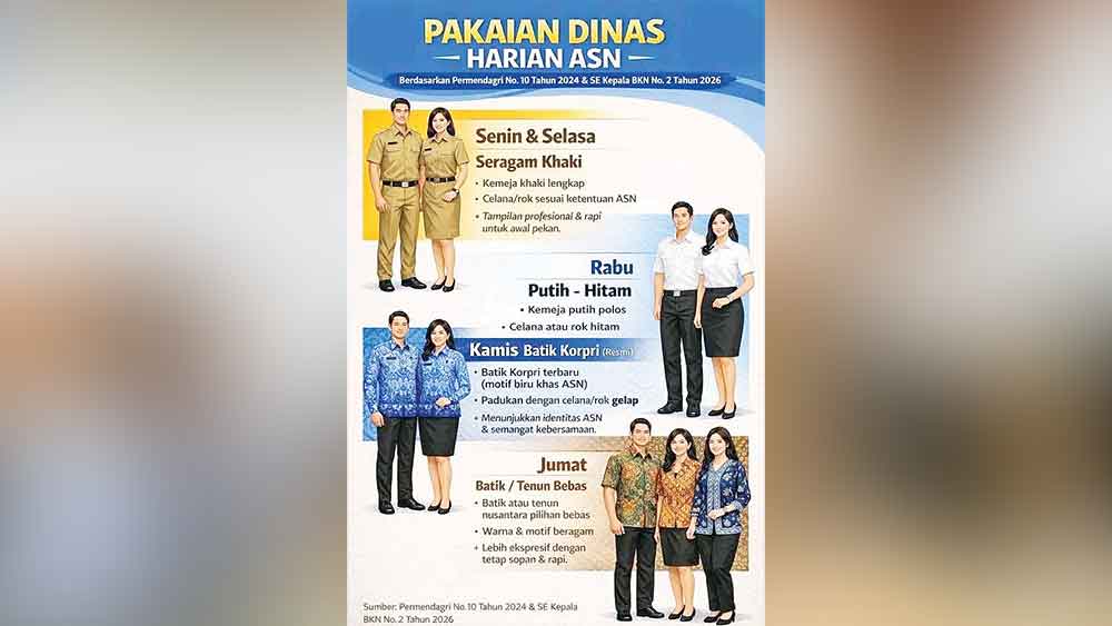 Ketentuan tersebut tertuang melalui Surat Edaran (SE) Kepala Badan Kepegawaian Nasional (BKN) Nomor 2 Tahun 2026. Dalam SE tersebut, ASN diinstruksikan memakai pakaian dinas harian (PDH) Khaki (coklat muda kekuningan hingga coklat kehijauan) untuk hari Senin dan Selasa.