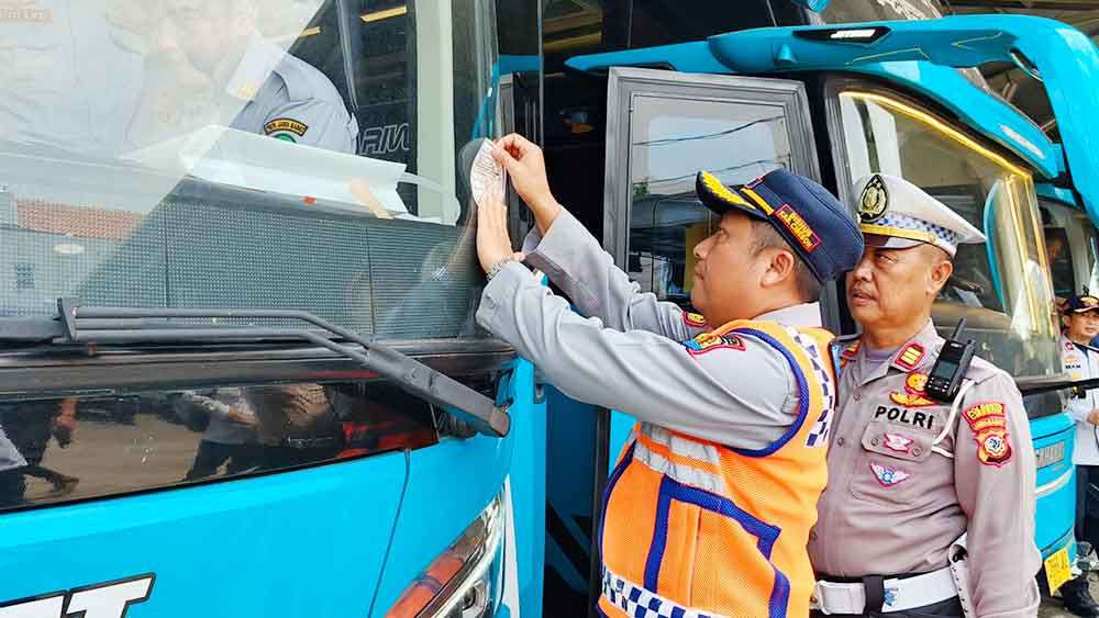 Pemasangan stiker pada bus yang dinyatakan layak dan laik beroperasi sebagai angkutan arus mudik dan balik Lebaran, Selasa, 10 Maret 2026.* (Foto: Vicky/Suara Cirebon)