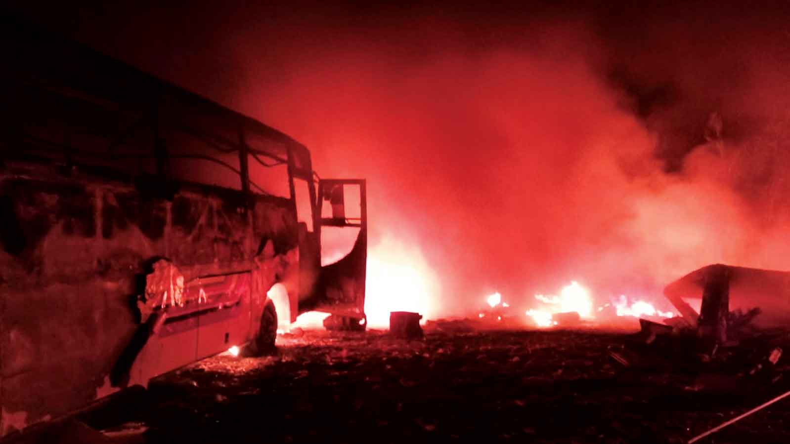 Ia menyampaikan, api berhasil dipadamkan setelah tim berjibaku kurang dari 30 menit. Akibat kejadian tersebut, dua unit bus rongsok, tumpukan jok mobil dan bahan mudah terbakar lainnya, ludes dilalap si jago merah.